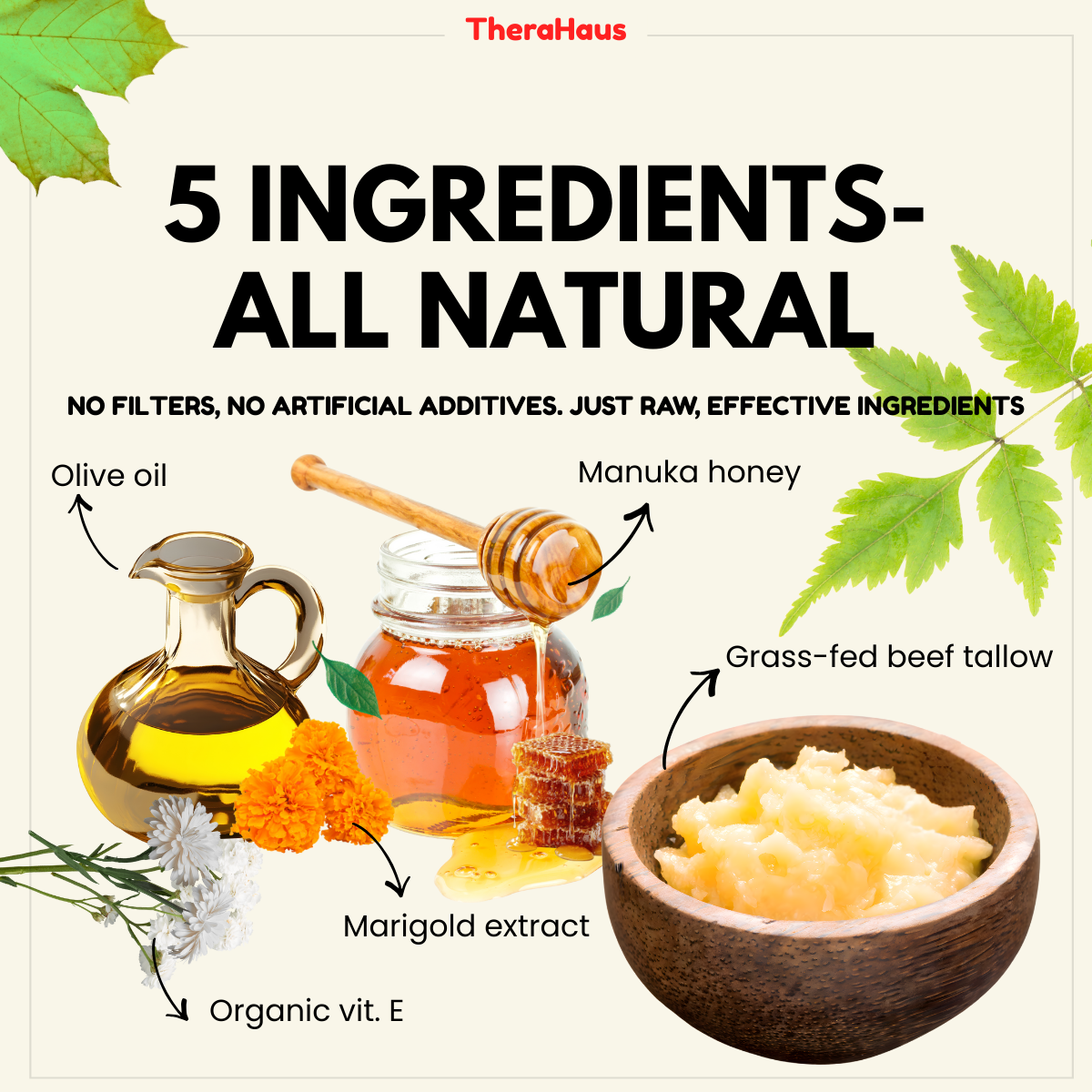 "Most synthetic creams weaken your skin’s natural barrier, causing dryness and faster aging. Grass-fed tallow and Manuka honey help rebuild that barrier, keeping your skin hydrated, balanced, and youthful."